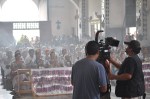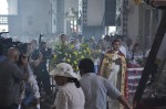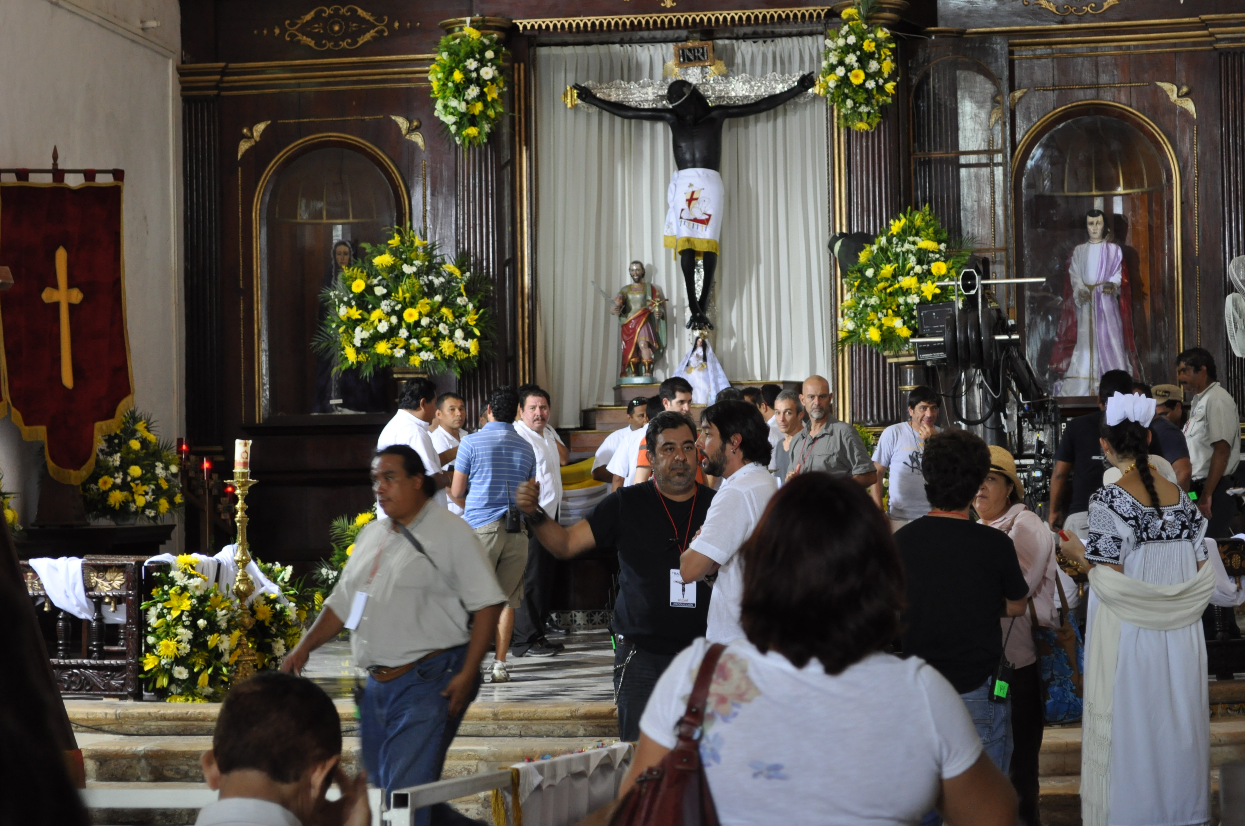 Se retira la cámara portátil y avanzan los portadores hasta el soporte en que colocaran al Cristo Negro para su veneración. El otro camarógrafo desmonta la cámara de la grúa y la coloca en otro soporte que se cuelga a la espalda. Hay gran movimiento entre toda la gente de producción, a la que me uní subrepticiamente como fotógrafa extraoficial, tenemos que ocultarnos para no salir a cuadro.
